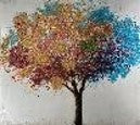 Ein Druckbild eines Baumes, bei dem bunte Kristalle und silberne Flecken handüberarbeitet wurden. Die natürliche Darstellung des Baumes wird durch die kunstvoll hinzugefügten Elemente von bunten Kristallen und glitzerndem Silber ergänzt, was dem Bild eine mystische und kunstvolle Qualität verleiht.